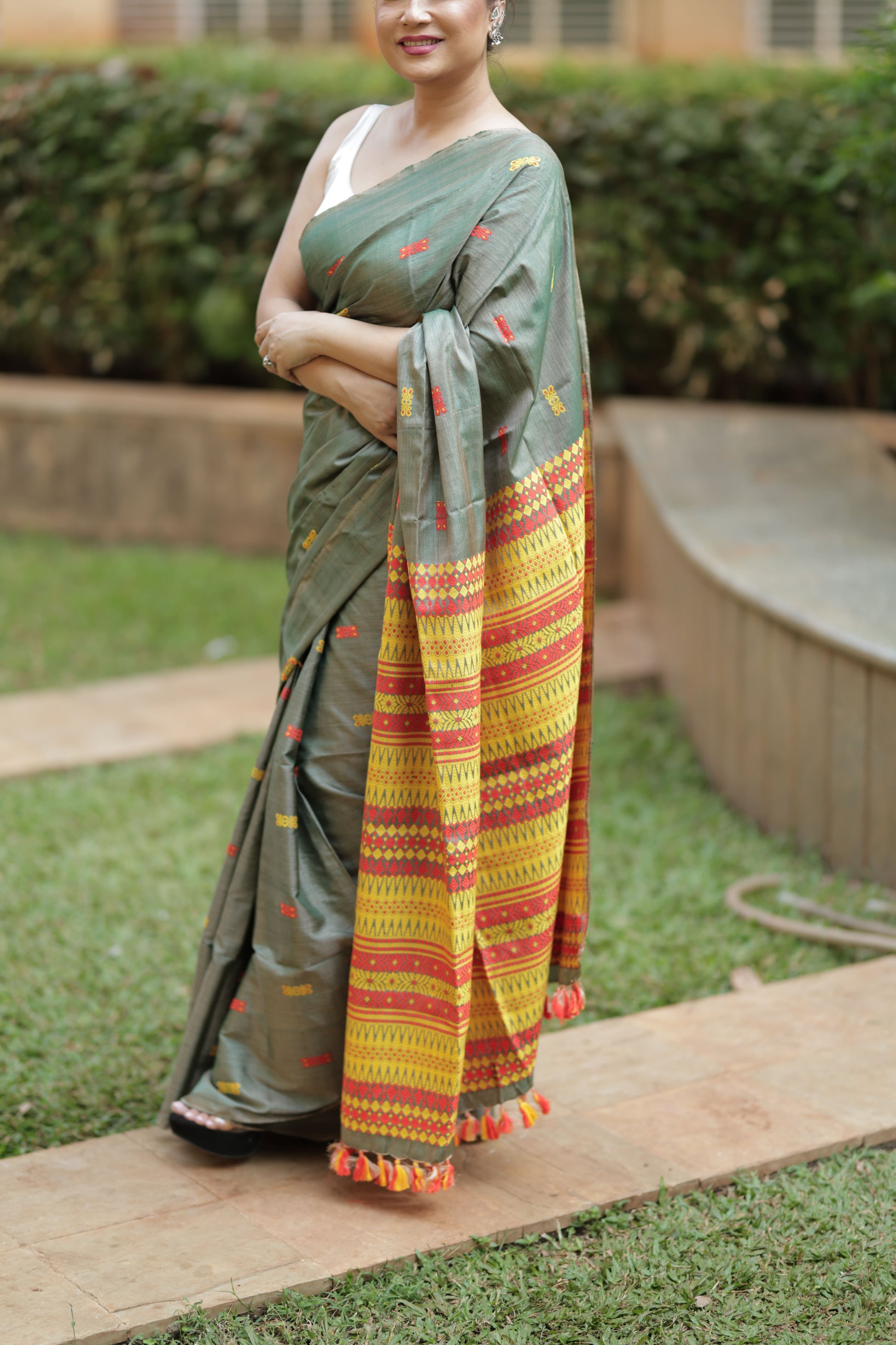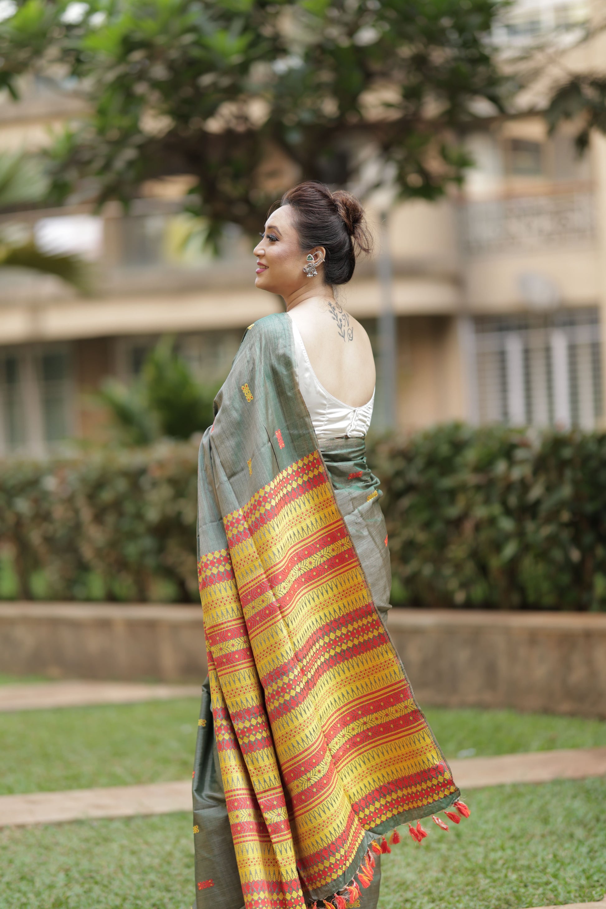 Drape yourself in earthy elegance with this olive green tussar and mulberry blended silk saree. Adorned with a vibrant pallu in shades of mustard yellow n red. The intricate geometric patterns add a rhythmic charm, while the rich contrast brings the peice alive- just like a golden sunset meeting the forest floor.