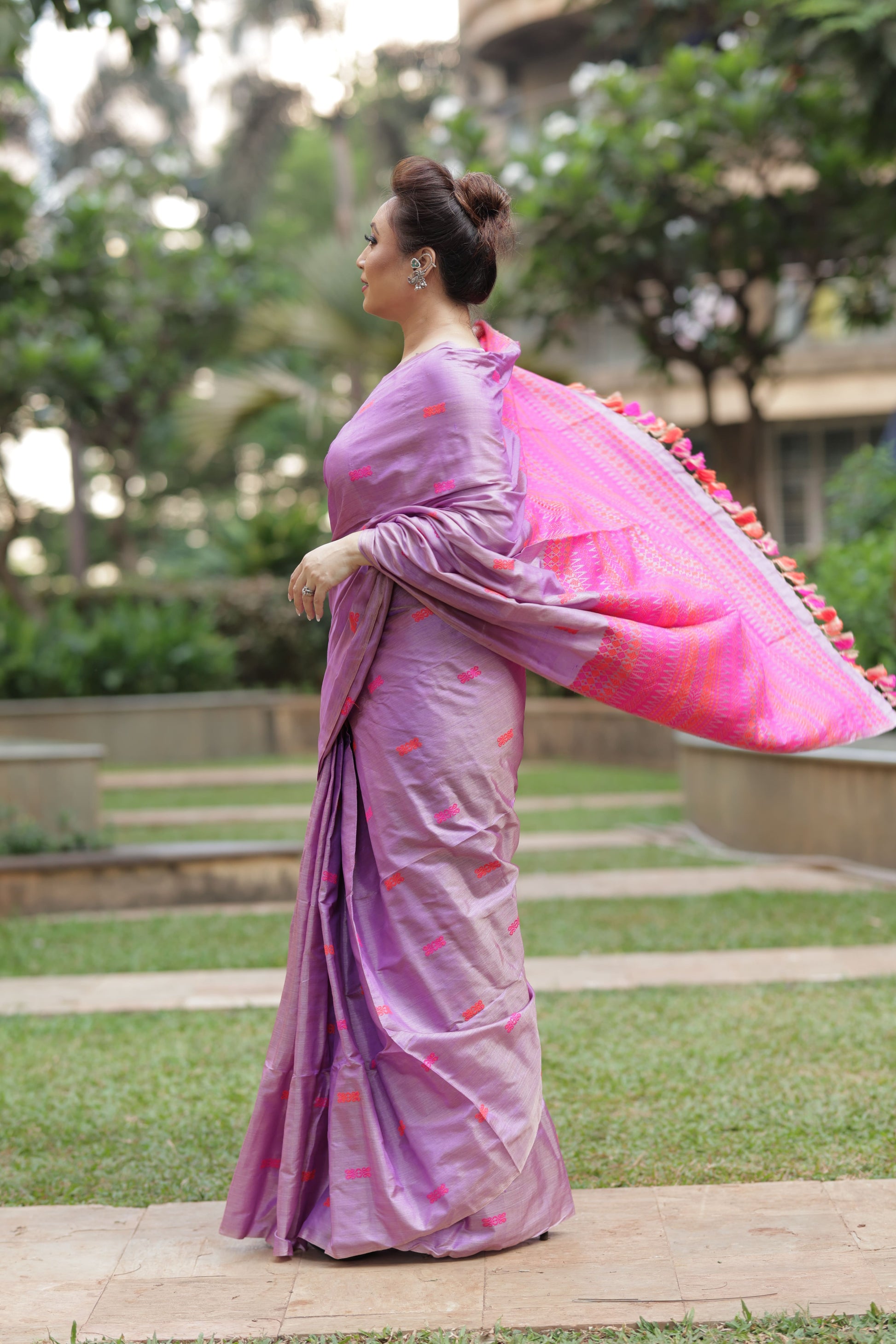 Embrace the enchanting allure of our lavender and pink tussar-mulberry silk saree. This exquisite piece blends the luxurious softness of mulberry silk with the unique texture of tussar, creating a stunning drape that flows gracefully with every movement flows gracefully. The delicate lavender and soft pink hues intertwine beautifully, evoking a sense of romance and tranquility. This saree adorns with subtle patterns that enhance its charm.