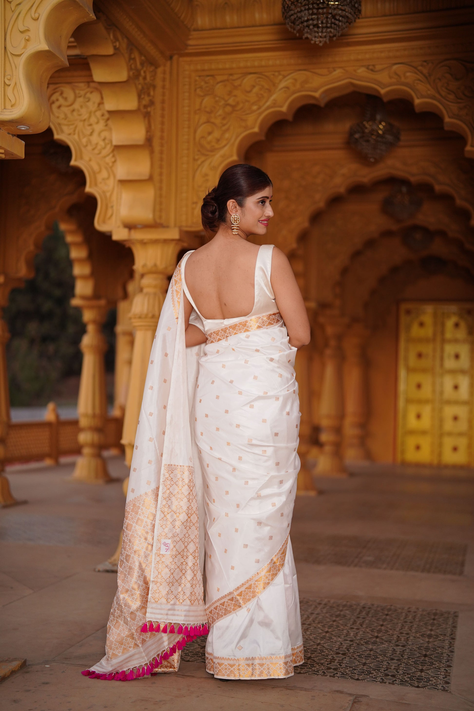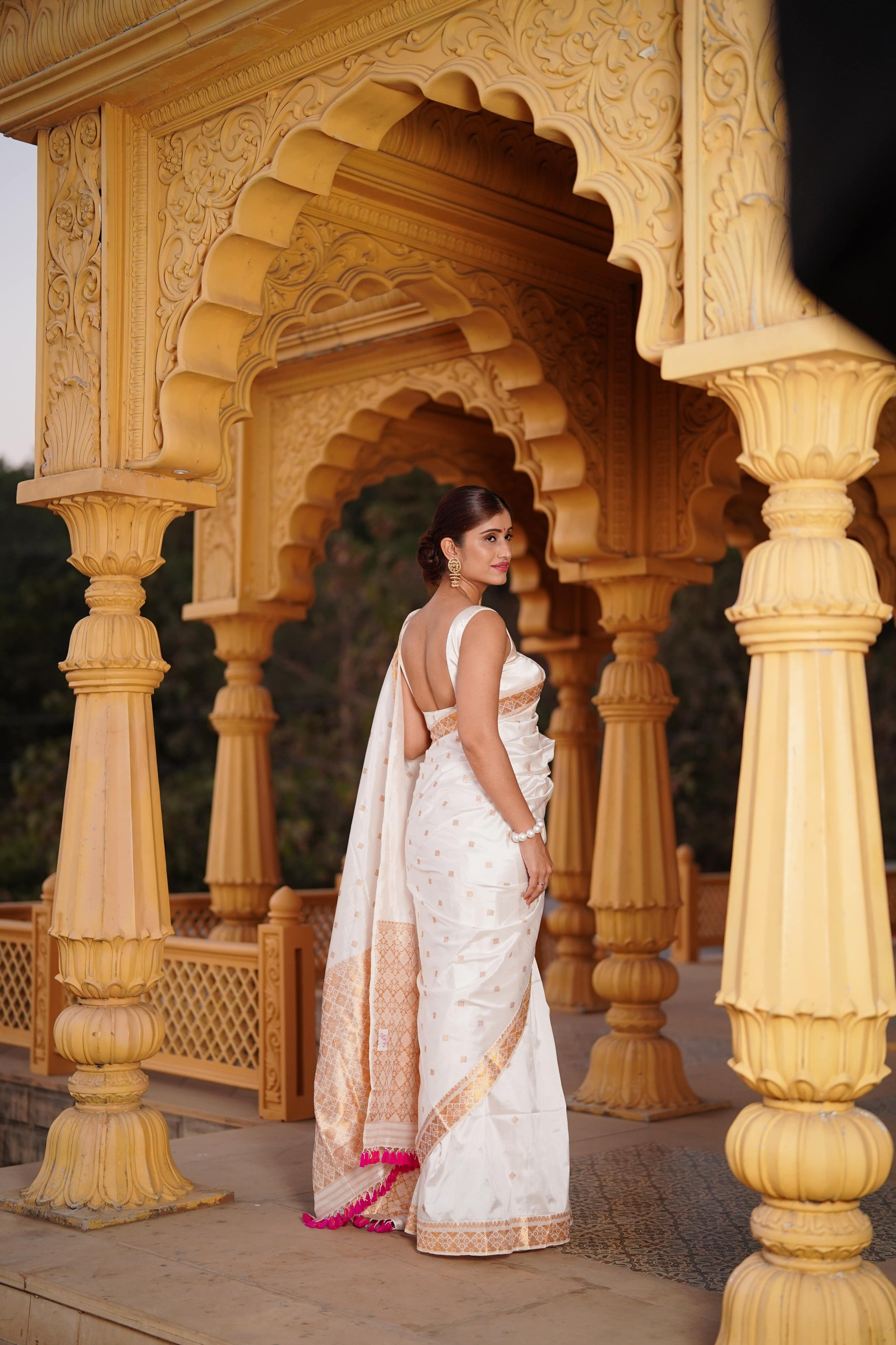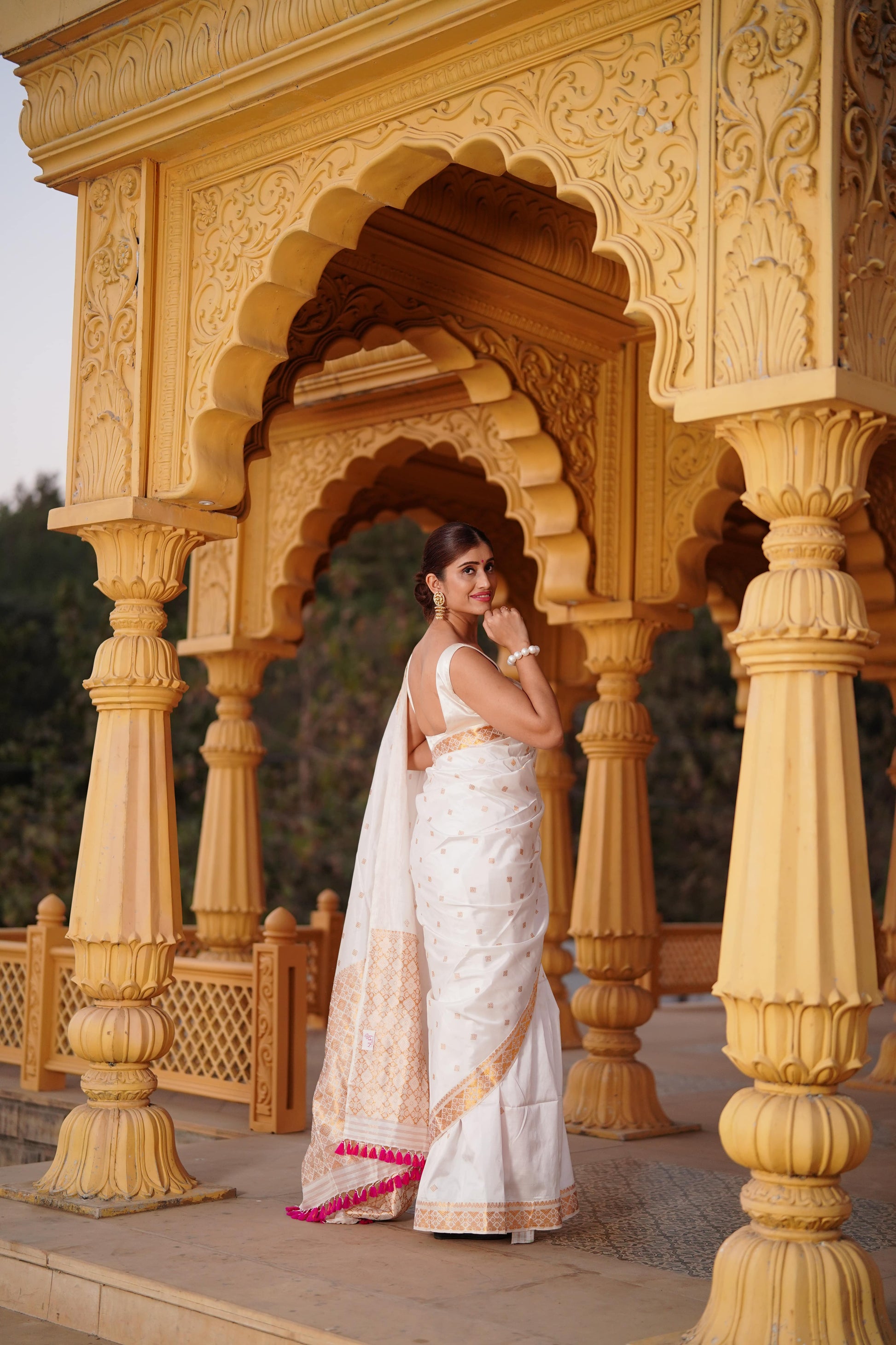 Elevate your style with our elegant off-white saree, a perfect blend of grace and sophistication. Crafted from lightweight silk, adorned with delicate details, it strikes the perfect balance between tradition and contemporary style. Pair it with your favorite accessories for a stunning look that leaves a lasting impression.
