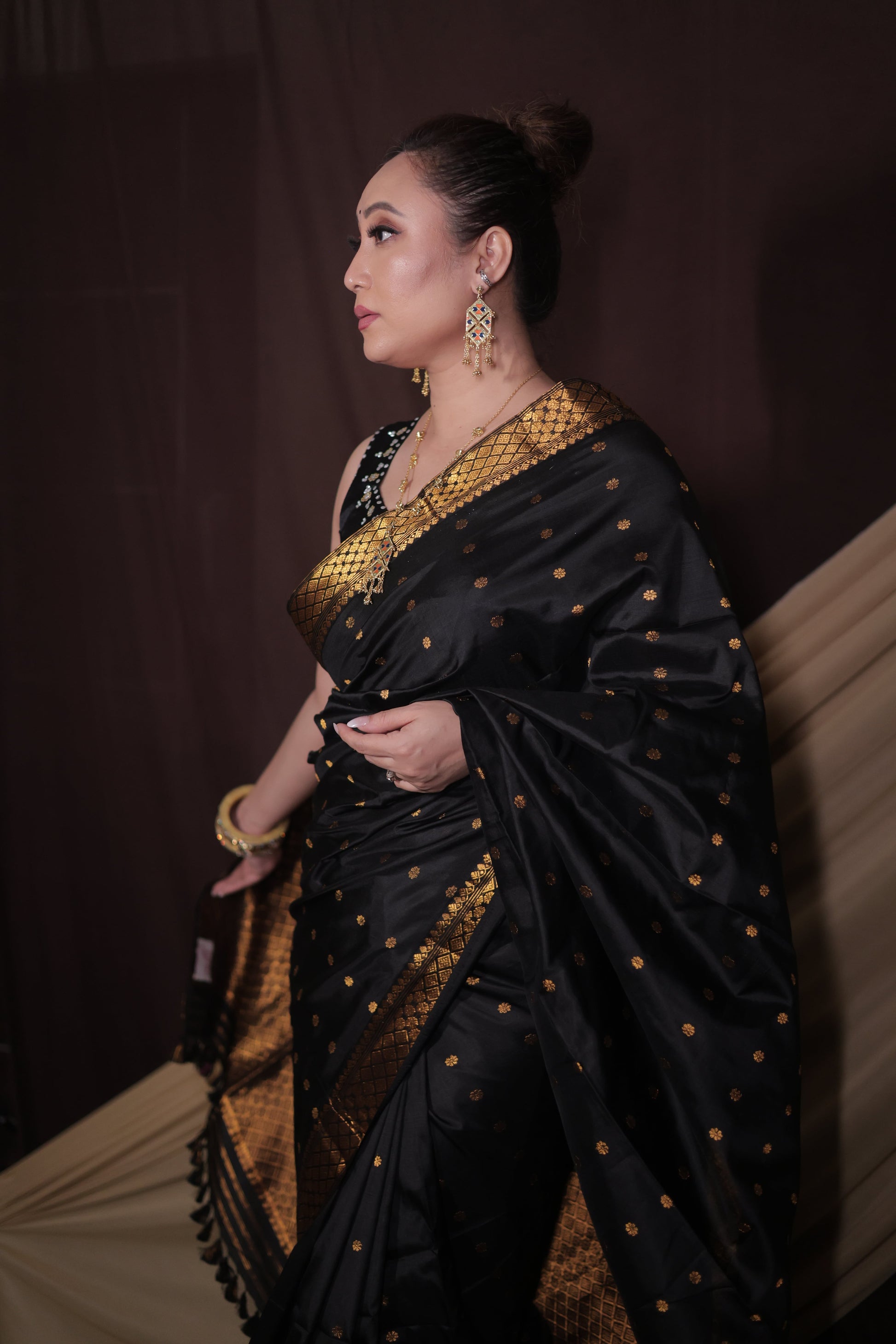 unveil timeless elegance with our elegant balck mulberry silk saree adorned with exclusive zari work. This luxurious saree showcases a rich black hue, perfectly complimented by intricate golden patterns that add an opulent touch. Elevate ur ethnic wardrobe with this stunning piece.