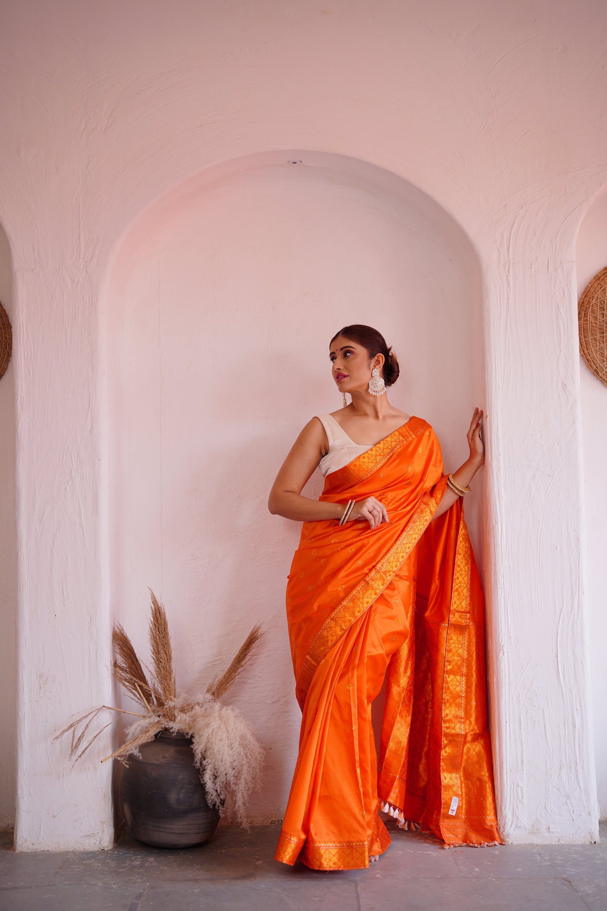 Elevate your wardrobe wih this exquisite orange mulberry saree, crafted from 100 % pure mulberry silk for a rich ,lustrous drape. The vibrant orange tone radiates warmth and celebration,making it a perfect choice for festive occassions, weddings and cultural gatherings.